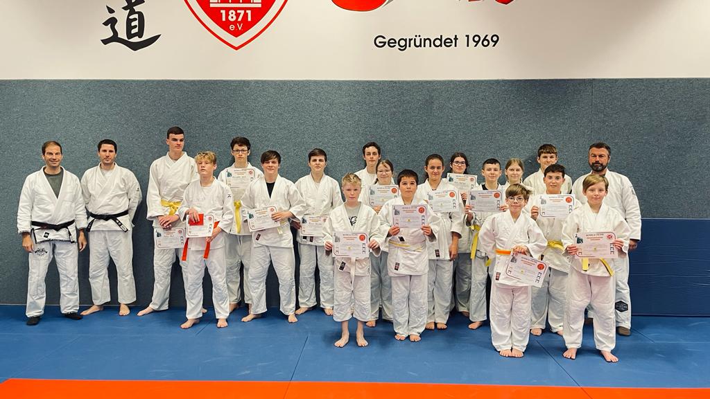 Am Ende durften acht Kinder (zweimal weiß-gelb, einmal gelb, fünfmal gelb-orange), neun Jugendliche (alle 4. Kyu, orange) sowie zwei Erwachsene (jeweils 5. Kyu, gelb) stolz ihre Urkunden entgegen nehmen.