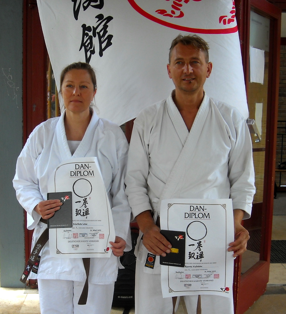 Am Samstag, den 21.5.2022 legten Marketa Leiss und Amko Ramic nach Monaten intensiver Vorbereitungszeit ihre Prüfungen zum 1. Dan (Shotokan Karate) ab. Die landesweite Dan-Prüfung, bei der insgesamt sieben Karatekas antraten, fand in Seeheim unter der Leitung von Karl-Heinz Griebenow ( 7. Dan, Karate Seeheim) und Heinz Zobus (6. Dan, Karate Geisenheim) statt. Vier anstrengende Stunden lang zeigten die Prüflinge ihr Können in den einzelnen Disziplinen Kihon, Kata, Bunkai und Kumite – und gaben dabei alles. Die Mühe lohnte sich und so konnten sie am Ende glücklich und erleichtert ihre Urkunden entgegen nehmen.